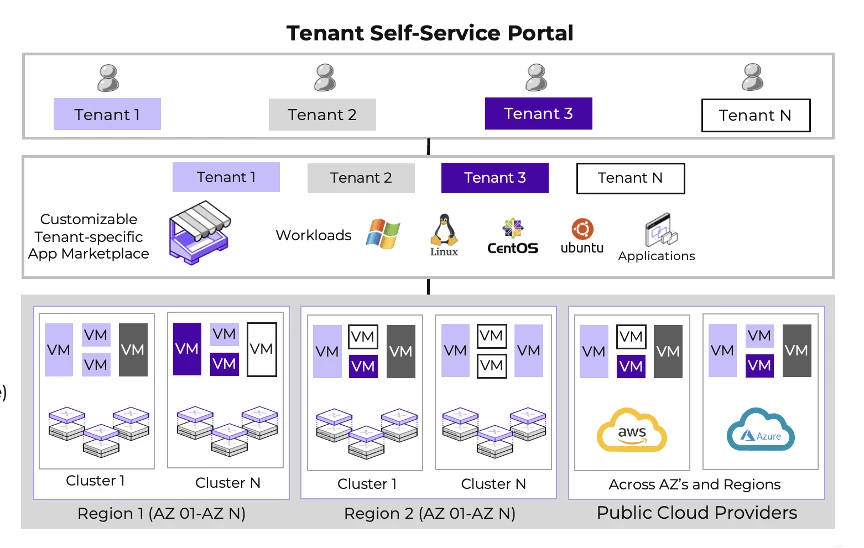 - Tenant-specific marketplace catalog – Service providers can curate and publish tenant-specific app blueprint templates with target VM images – including Linux, Windows, CentOS and Ubuntu – and application stack as required with automation runbooks so tenants can self-manage the lifecycle of their workloads.