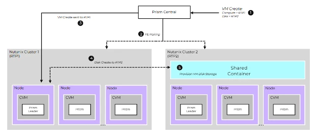 What you see diagrammed here is a high-level overview of the creation of a new virtual machine. We have a single Prism Central instance managing two clusters: RTP1 and RTP2. The process starts when the operator initiates the VM creation in the UI. What isn’t shown is the creation of the container with the setting ‘shared.’ It’s fairly straightforward, just a simple setting during the same container creation workflow that we all know and love that allows it to be utilized from another cluster.