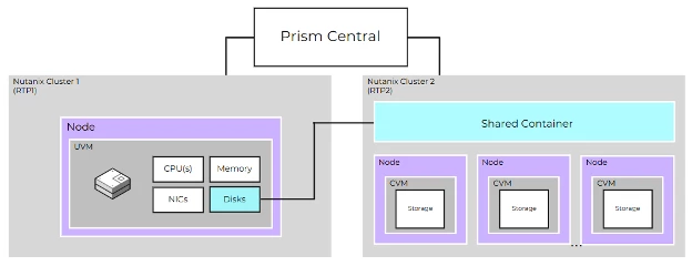 This is made possible by allowing our AHV hypervisor to place virtual disks on an AOS storage container located on a separate Nutanix cluster. As the image above shows, a VM is created on one cluster, but the virtual machine is consuming storage located on a different cluster. You probably already noticed an interesting notation in the image, the notion of a “shared container”. With the generally available release of AOS 7.5, Prism Central 7.5 and AHV 11, a storage container can now be created with a property that allows it to be shared with other clusters. Pretty cool!