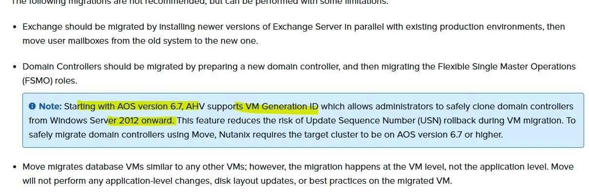 We use a virtual Windows Server 2022 as our current domain controller. We also have a backup domain controller (virtual server). According to some of the Nutanix documentation, migrating the domain controller using Move could cause issues. Has any of you had a similar situation? If I don't want to set up a domain controller on a physical server, what's the solution for this issue?
