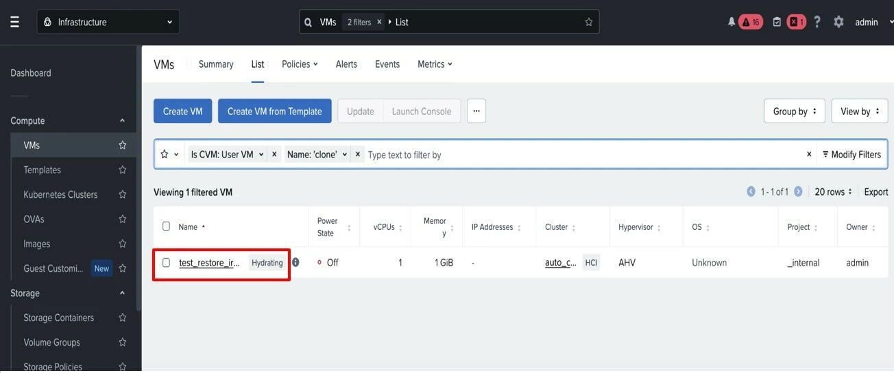 In Prism Central, recovered VMs and volume groups display a Hydrating flag alongside a real-time counter of remaining bytes so your team always knows where they stand. Once hydration completes, the flag clears and the entity operates entirely from local storage.