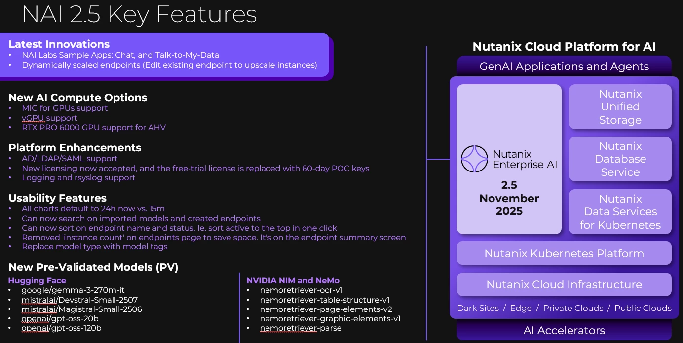 Nutanix Enterprise AI (NAI) is a centralized inferencing control plane that deploys and manages LLMs and their endpoints (OpenAI-compliant APIs) that’s simple, secure, and sovereign helping you standardize generative AI infrastructure across an organization, including delivering AI resources to your applications, developers, and data scientists. NAI deploys on any CNCF-certified Kubernetes, that can run at the edge, datacenter, public clouds, or even in an air-gapped environment.