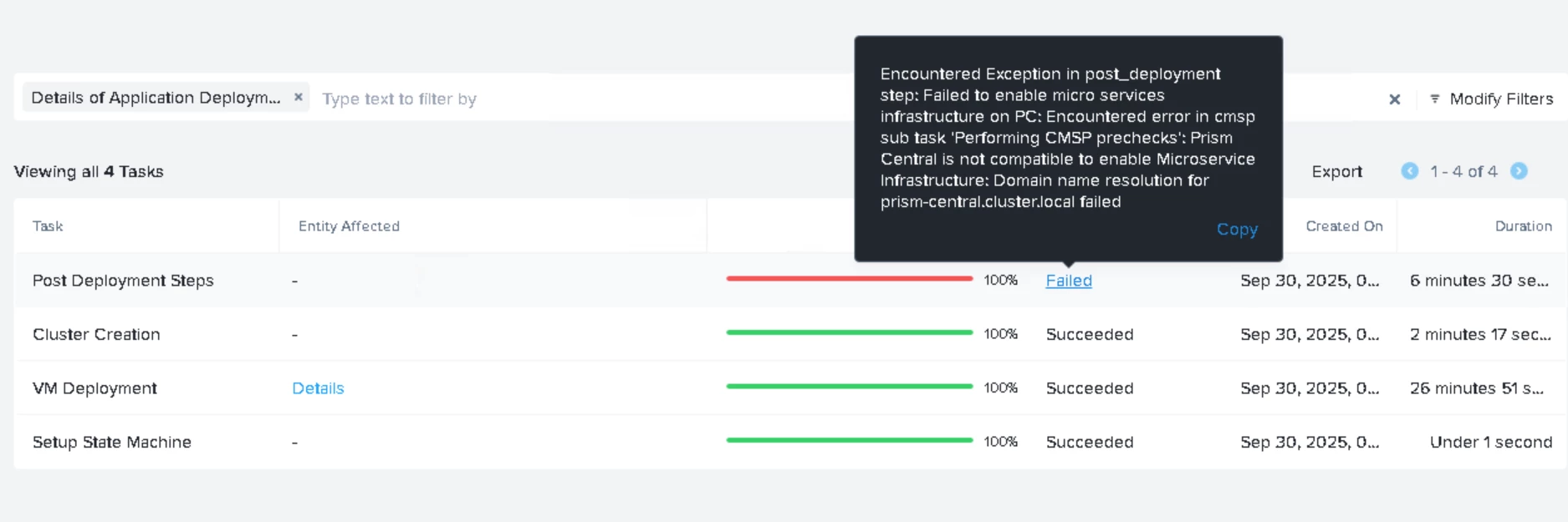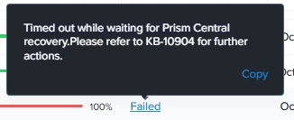 Every time, the restoration operation fails at around 92% with different errors - “Encountered Exception in post_deployment step: Failed to enable micro services infrastructure on PC: Encountered error in cmsp sub task 'Performing CMSP prechecks': Prism Central is not compatible to enable Microservice Infrastructure:Domain name resolution for prism-central.cluster.local failed” or “timed out while waiting for Prism Central recovery”.